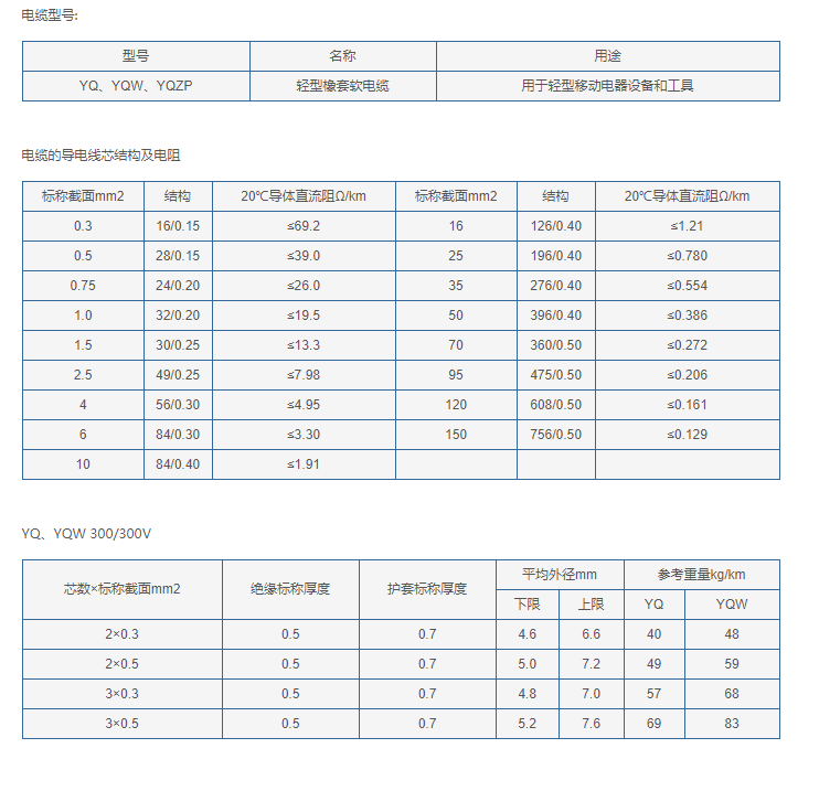 YQ YQW 輕型橡套電纜