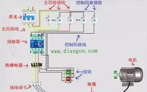 電路當中,要想讓電機轉動,就必須給電機接線柱通入三相交流電,如圖所示,合上電源開關,三相交流電通過黃綠紅三根主回路線流經主回路保險、接觸器主觸點、熱繼電器主端子、接線端子、電纜、最后到電機接線柱,只要接觸器吸合,接通,電機就會轉動,接觸器釋放,電機就停止,這就是主回路。但接觸器怎么才能吸合呢?www.diangon.com就需要控制回路控制接觸器,控制回路給接觸器線圈通電,接觸器就吸合,斷電就釋放。控制電流通過控制保險,黑色控制線、按鈕、熱繼電器輔助觸點、接觸器輔助觸點、到接觸器線圈,按下啟動按鈕,接觸器線圈通電,吸合,主觸點閉合,控制主回路接通。按下停止按鈕,接觸器線圈斷電,釋放,主觸點斷開,主回路斷電。這就是主回路和控制回路的關系。